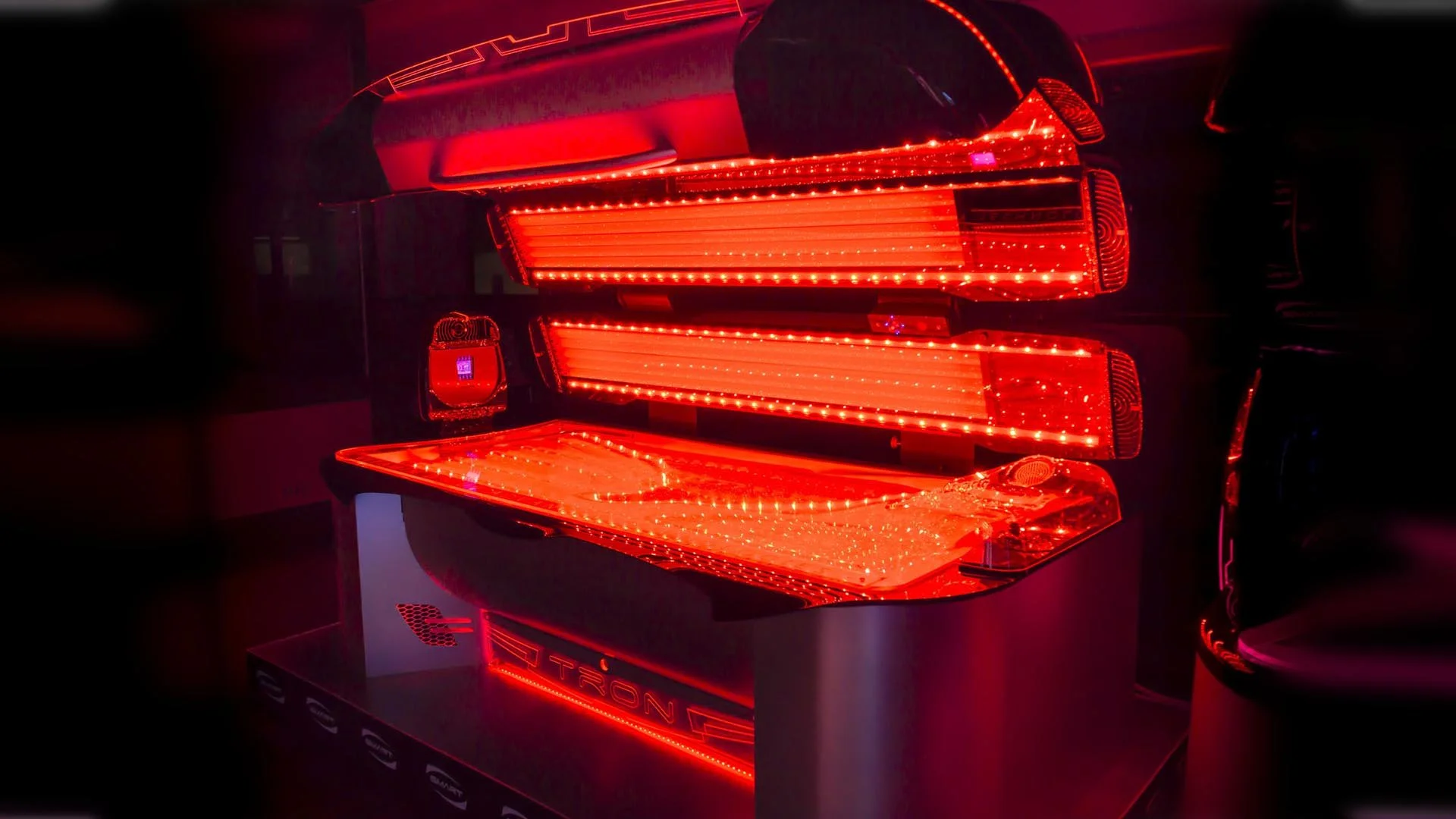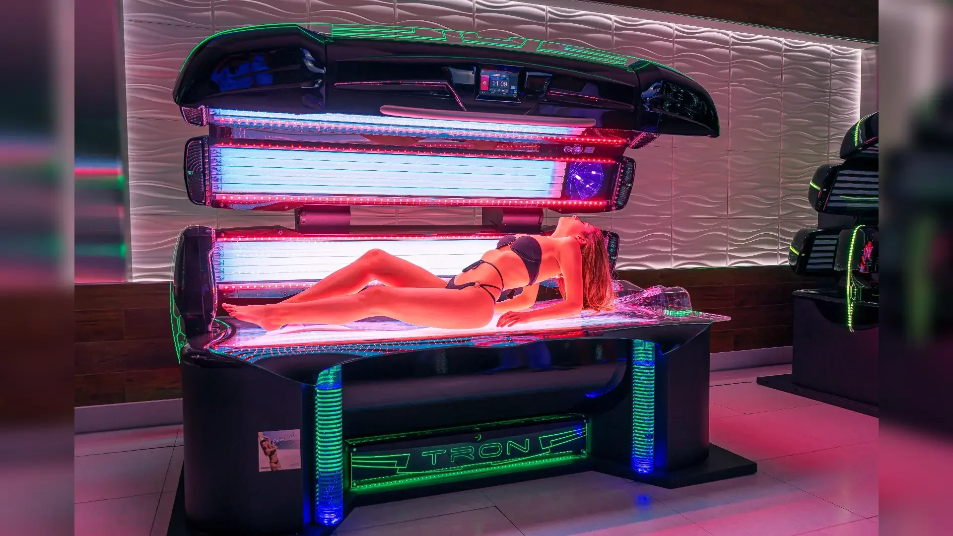Our TRON UV + Collagen LED sunbed is equipped with state-of-the-art features to ensure your comfort throughout your visit, including cooling airflow and a refreshing water mist system for a truly enjoyable experience. With custom ambient lighting and advanced technology, every session feels both luxurious and effective.
